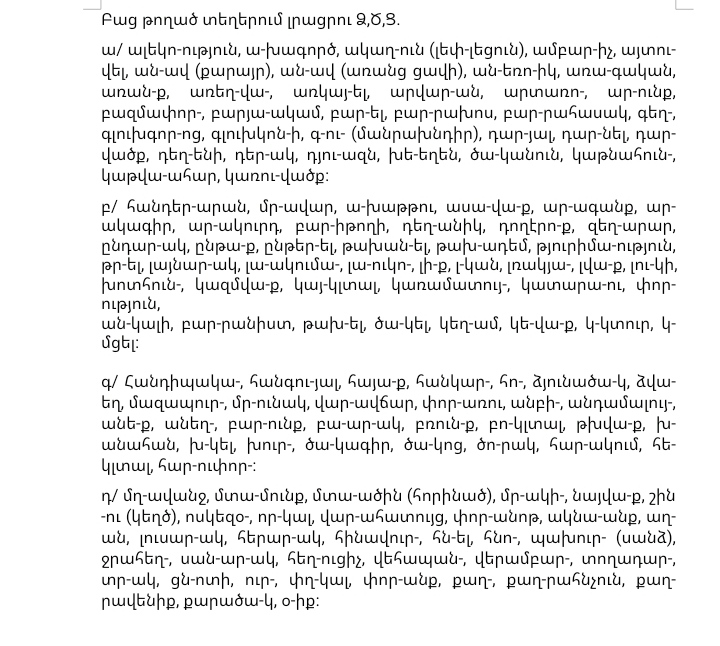 ալեկոծություն, ածխագործ, ակաղձուն (լեփ-լեցուն), ամբարձիչ, այտուցվել, անձավ (քարայր), անցավ (առանց ցավի), անձեռոցիկ, առաձգական, առանցք, առեղծած, առկայծել, արվարձան, արտառոց, արցունք, բազմափորձ, բարյացակամ, բարձել, բարձրախոս, բարձրահասակ, գեղձ, գլուխգործոց, գլուխկոնծի, գծուծ(մանրախնդիր), դարձյալ, դարձնել, դարձվածք, դեղձենի, դերձակ, դյուցազն, խեցեղեն, կաթնահունց, կաթվածահար, կառուցվածք: